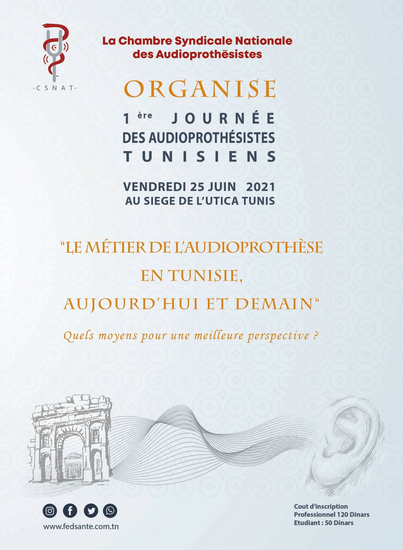 Avec une grande fierté et un immense plaisir que nous vous annonçons l’organisation par la Chambre Syndicale Nationale des Audioprothésistes Tunisiens CSNAT de la 1ere Journée de l’audioprothèse, le 25 juin 2021 au siege de l’UTICA Tunis .